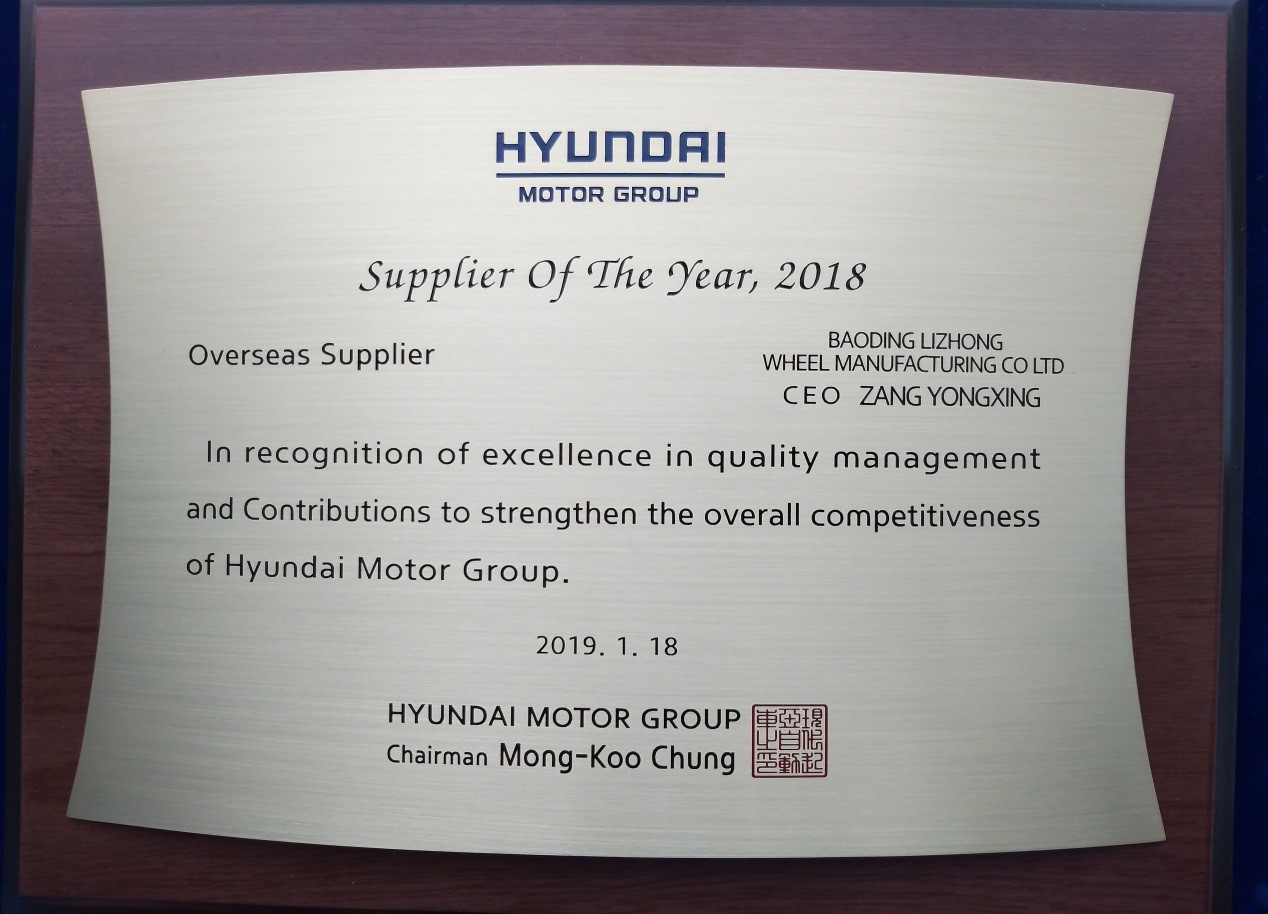 2019年1月,現(xiàn)代起亞汽車(chē)集團(tuán)授予保定市立中車(chē)輪制造有限公司“優(yōu)秀供應(yīng)商”獎(jiǎng)項(xiàng)并頒發(fā)證書(shū)。集團(tuán)總裁張建良先生作為集團(tuán)代表出席了大會(huì)并接受頒獎(jiǎng)。 此獎(jiǎng)項(xiàng)是現(xiàn)代起亞汽車(chē)集團(tuán)對(duì)供應(yīng)商開(kāi)發(fā)能力、交付能力及品質(zhì)保證的全面認(rèn)可,意義非凡。